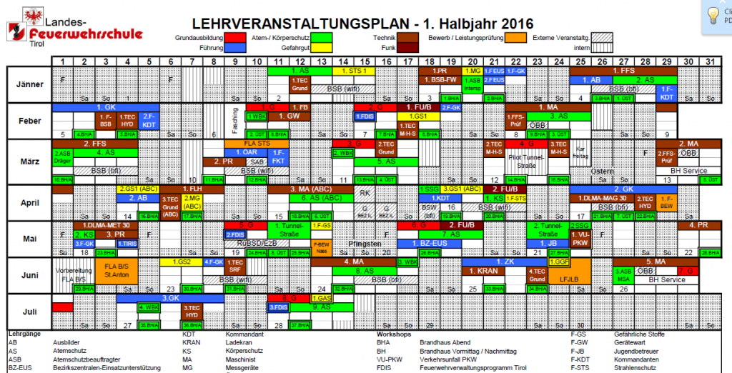 Ab sofort ist der neue Lehrveranstaltungsplan des 1. Halbjahres 2016 verfügbar! [wpdm_package id=’3967′] Mit dem Programm 2016 werden an der LFS folgende neue Lehrveranstaltungen angeboten bzw. bestehende Angebote angepasst: Fortbildung Gruppenkommandanten (F-GK) Zielgruppe: Diese Fortbildung richtet sich an aktive Führungskräfte Ziel: Die Veranstaltung gilt als Auffrischung des Wissens für Feuerwehr-Führungskräfte, welche die Führungs-Lehrgänge Gruppenkommandant, Zugskommandant […]
