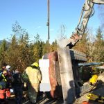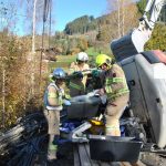 Ein 7,5 Tonnen-Bagger stürzte über eine Böschung. Dabei wurde der Fahrer in seiner Kabine eingeklemmt. Nachdem der Bagger mit der Seilwinde des schweren Rüstfahrzeuges gesichert wurde, konnte das Kabinendach mit der Bergeschere abgeschnitten und so ein Zugang zum Verunfallten geschaffen werden. Nach der ersten medizinischen Versorgung durch den Notarzt des C 4 wurde anschließend der verletzte Fahrer aus seiner misslichen Lage befreit und anschließend mit dem Notarzthubschrauber nach St. Johann geflogen. Der sich noch im Tank des Baggers befindliche Diesel konnte von der Feuerwehr entfernt werden.