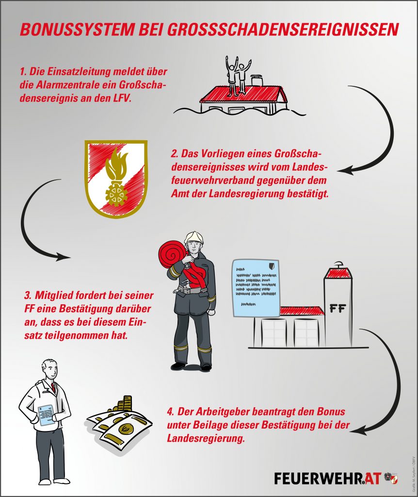 Der Bonus kann nur beantragt werden, wenn die Einsatzkraft Dienstnehmer ist. (Auch dazu hat der Vorschlag des Österreichischen Bundesfeuerwehrverbandes anders ausgesehen, die Forderung des ÖBFV nach Einbeziehung von Landwirten und Selbständigen bleibt aufrecht.) Voraussetzung ist, dass anlässlich des Einsatzes eine Dienstfreistellung im arbeitsrechtlichen Sinn und kein Urlaub vorliegt. Der jeweilige Dienstgeber erhält einen Bonus in Höhe von 200 Euro pro freigestelltem Arbeitnehmer und Tag. Keinen Antrag auf Bonusgewährung können jedoch öffentlich-rechtliche Körperschaften sowie Unternehmen, die zu mehr als 50% im Eigentum solcher Körperschaften stehen, stellen.
