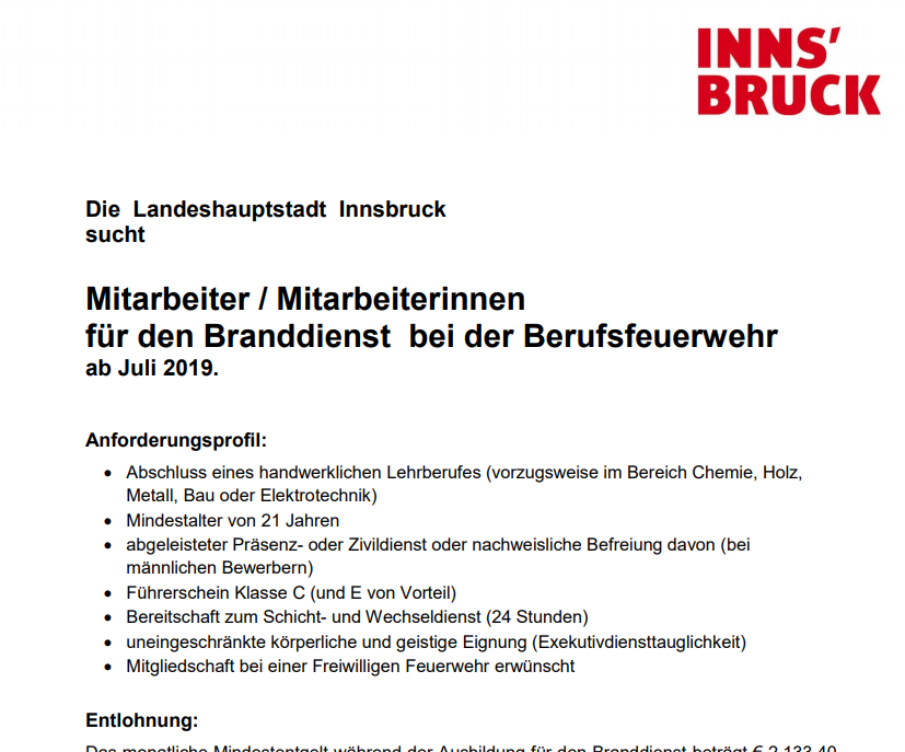 Stellenausschreibung Berufsfeuerwehr Innsbruck