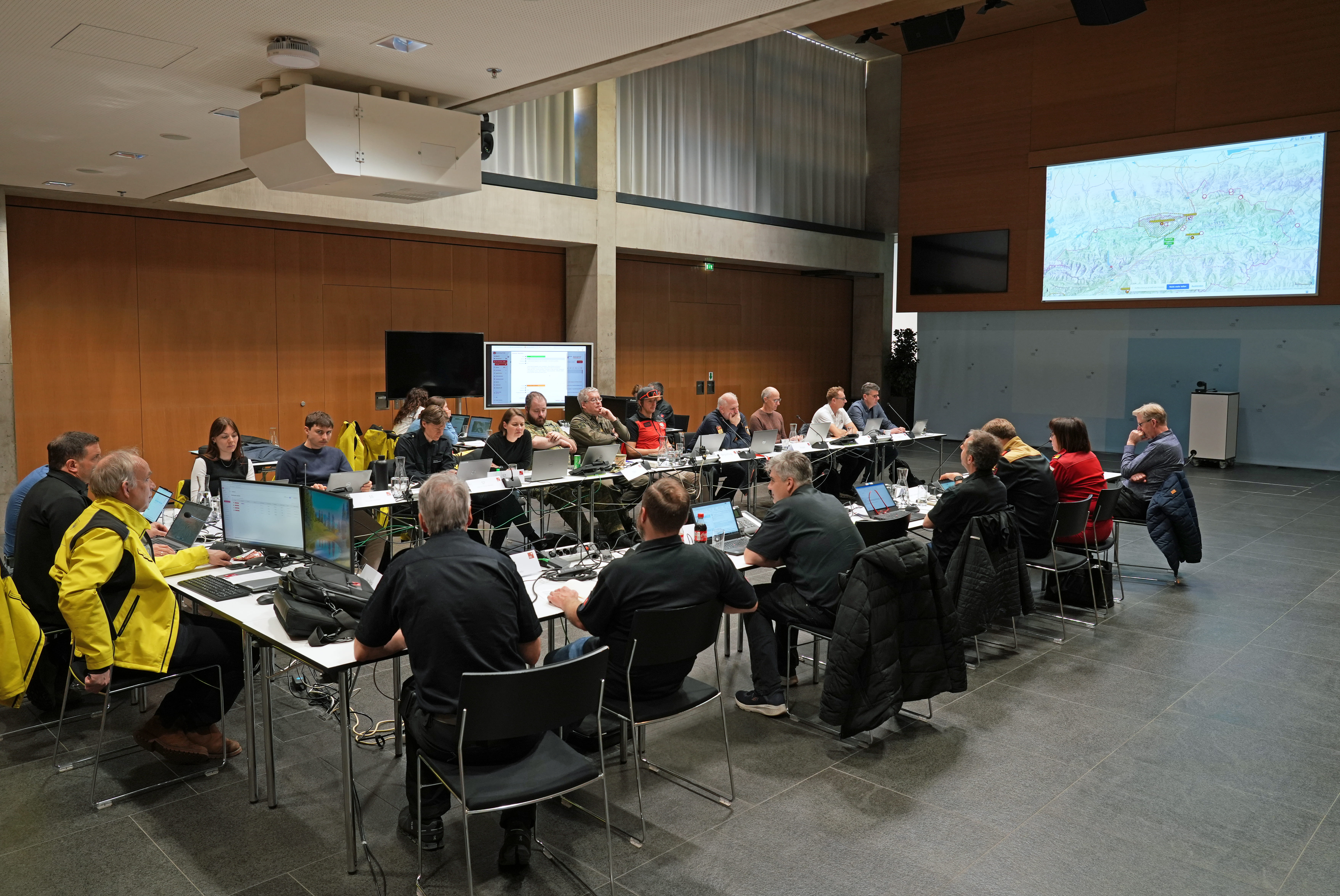 Bereits seit Mittwoch übten die Einsatzstäbe in Tirol und Salzburg. Ausgangspunkt war ein fiktives Extremwetterszenario mit massiven Schneefällen – zu meistern waren mitunter großflächige Stromausfälle, gesperrte Verkehrswege, abgeschnittene Gemeinden, gestrandete Gäste und akute Lawinengefahr. Die Übung war an das Extremwetterereignis im Winter 2019 angelehnt. Ziel war es, die länderübergreifende Abstimmung in einer eskalierenden Lage zu trainieren. Laufend eingespielte neue Entwicklungen verlangten rasche Entscheidungen, klare Prioritätensetzungen und eine präzise Kommunikation nach innen und außen. Seitens der Tiroler Feuerwehren wurde hier ein Verbindungsoffizier des Landes-Feuerwehrverbandes in den Stab entsendet.