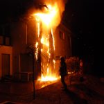 Heller Flammenschein wies den erstanrückenden Kräften den Weg. Bei einem Einfamilienhaus in Holz-Riegelbauweise stand beim Eintreffen des ersten Löschfahrzeuges die Fassade an der Südwestseite in Vollbrand. Reichlich Nahrung gab es für die Flammen durch den Vollwärmeschutz, sodass aufgrund der Brandintensität bereits zwei Fensterscheiben zersprungen waren.
