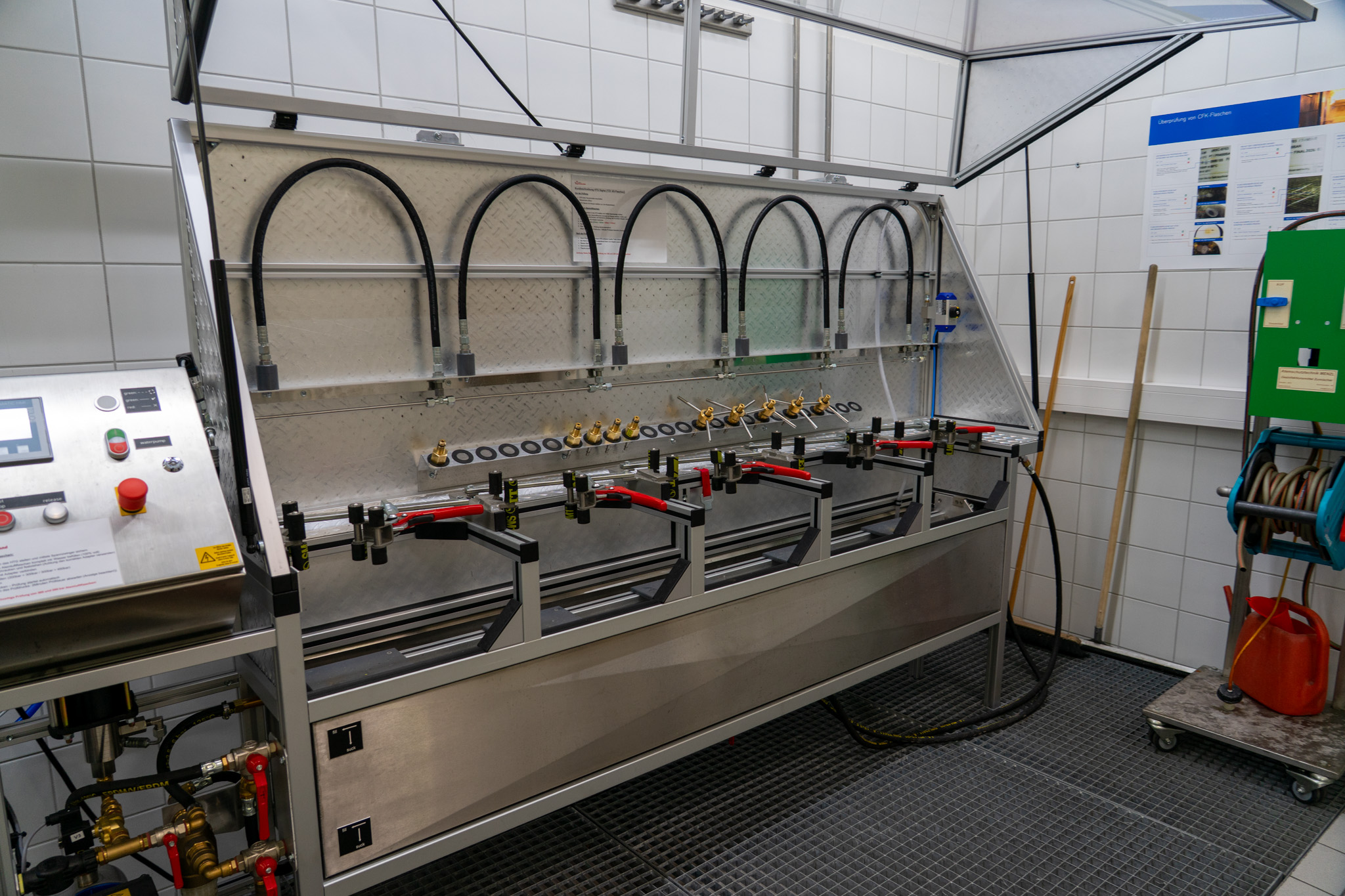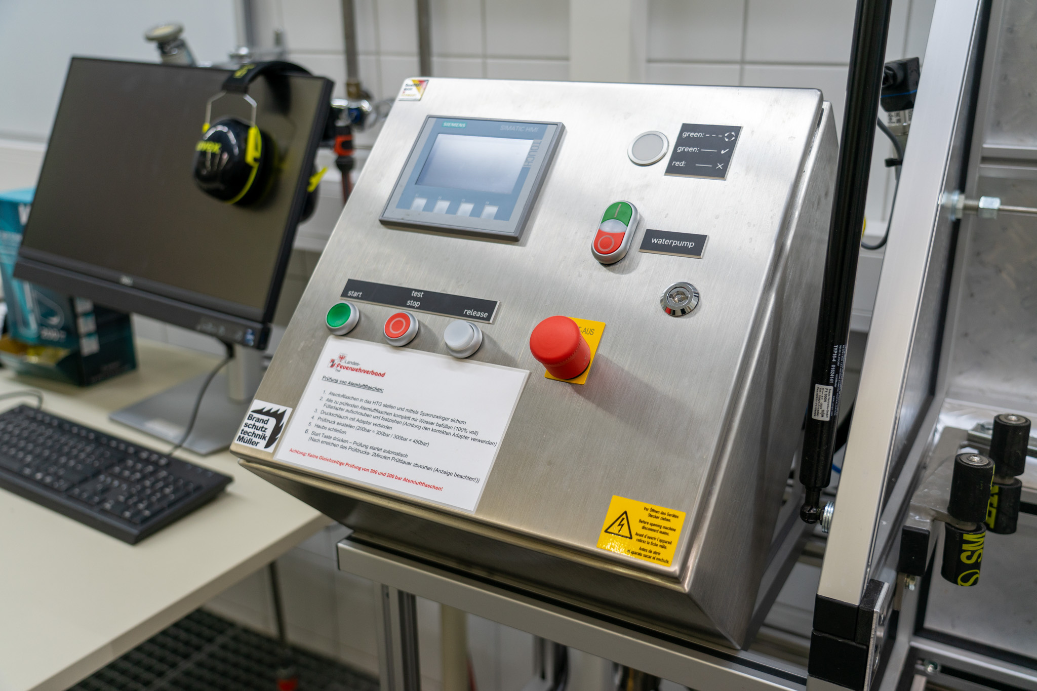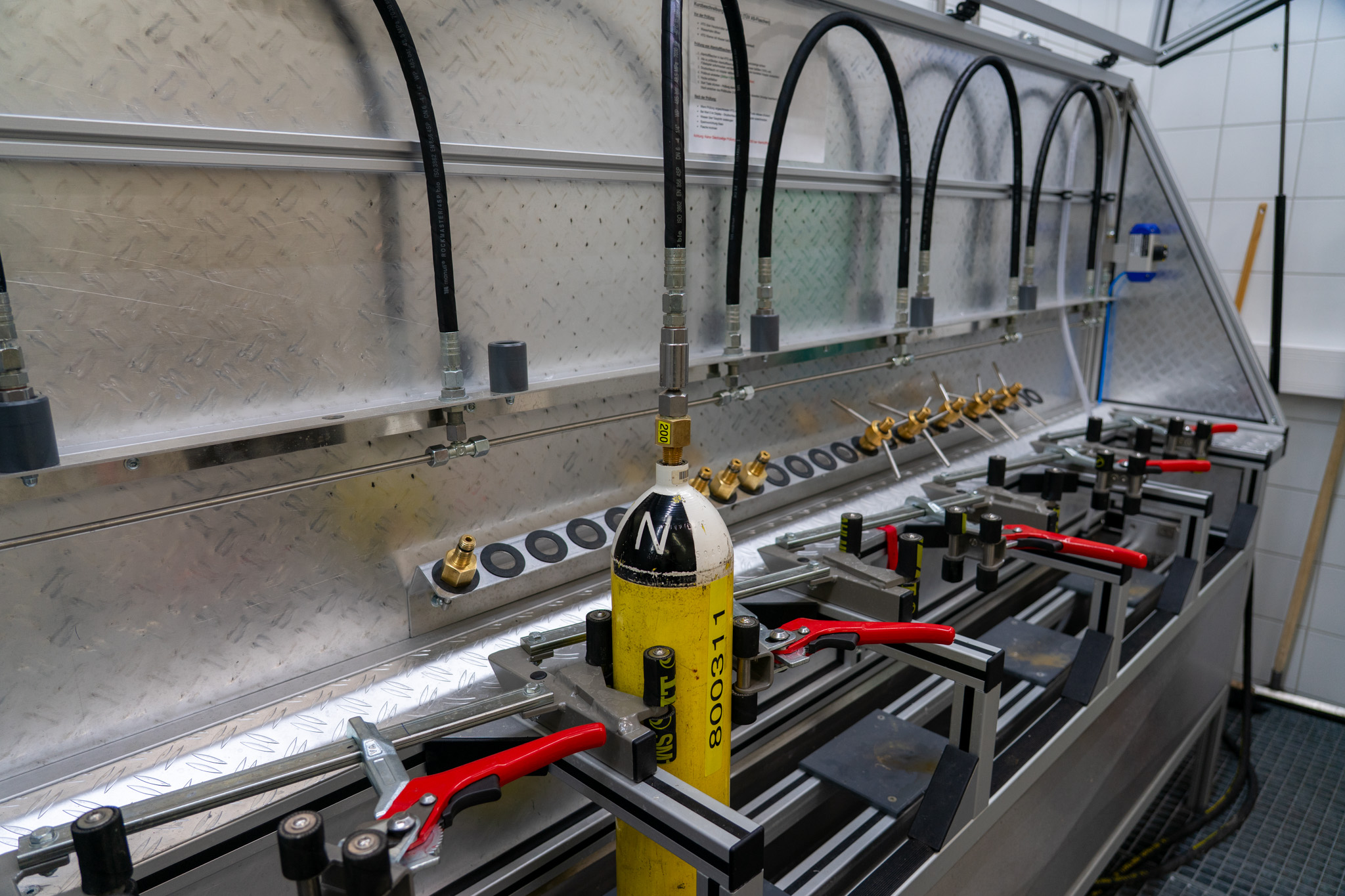 Seit Herbst 2025 verfügt die Tiroler Atemschutzwerkstatt nun selbst über eine Anlage zur hydrostatischen Druckprüfung und kann diese direkt in Telfs durchführen. Die im Zuge des Ventilservices bereits drucklosen Flaschen werden dazu mit Wasser befüllt und in den Prüfstand eingespannt. Anschließend erfolgt eine Druckprüfung über zwei Minuten mit 450 Bar bei CFK-Flaschen bzw. 300 Bar bei Stahlflaschen. Fällt dabei eine Undichtigkeit oder eine andere Unregelmäßigkeit auf, wird die Prüfung abgebrochen und die betroffene Flasche ausgesondert.
