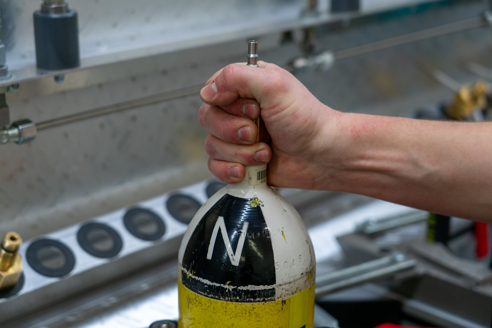 Im nächsten Schritt wird das Ventil ausgebaut, serviciert und auf etwaige Auffälligkeiten kontrolliert. Im Anschluss wird es mit exakt vorgegebenem Drehmoment wieder zusammengebaut. Bei der Flasche selbst erfolgt eine sorgfältige Sicht- und Innenprüfung der Flaschen durch einen zertifizierten TÜV-Prüfer, um mögliche Unregelmäßigkeiten frühzeitig zu erkennen.