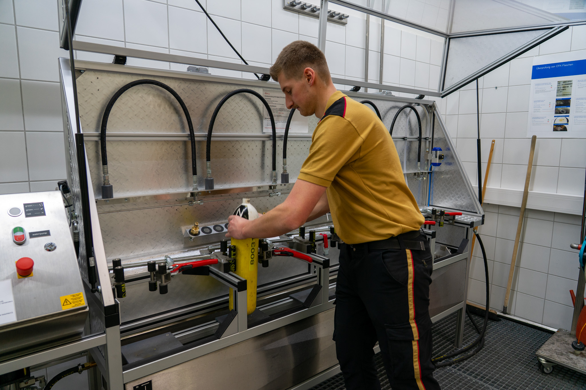 Dank des neuen landesweiten Atemschutzflaschenpools können Ersatzbeschaffungen in solchen Fällen nun deutlich einfacher und schneller abgewickelt werden. Nach erfolgreicher Prüfung werden die Flaschen am eigenen Trockenstand getrocknet, die Ventile wieder montiert, die Flasche erneut mit Atemluft befüllt und eine Letztkontrolle der Dichtheit über einen längeren Zeitraum durchgeführt.