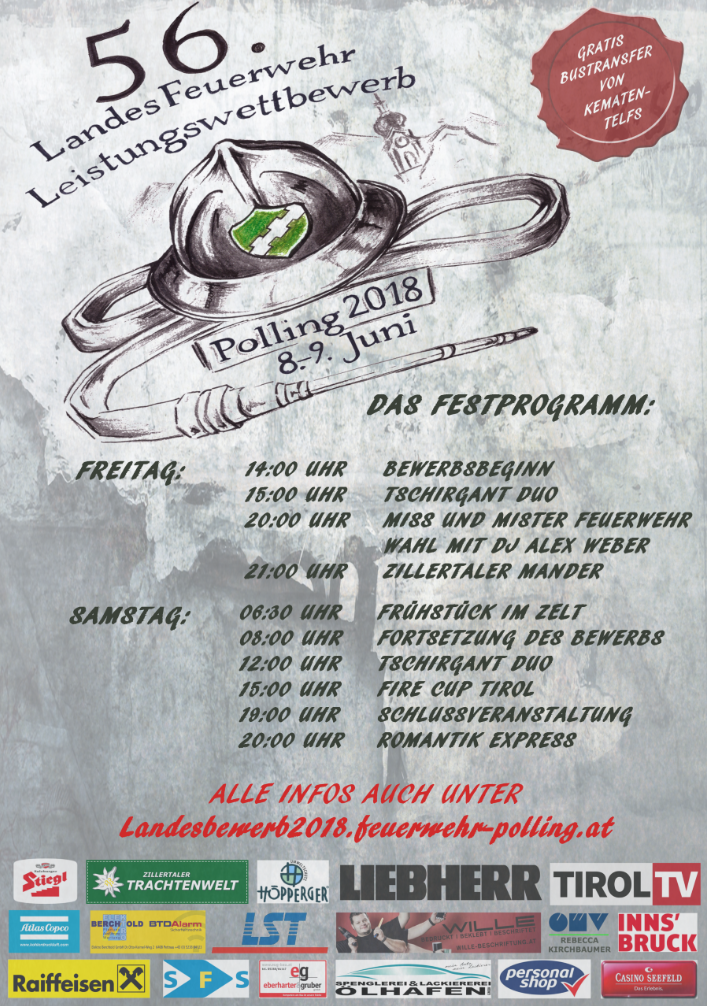 Vom 08. bis 09. Juni 2018 findet in Polling, Bezirk Innsbruck-Land der 56. Landes-Feuerwehrleistungsbewerb statt! Hier steht das Festprogramm zum Großereignis zur Verfügung.