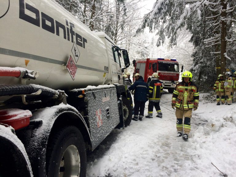 Ein mit über 15.000 Litern Kerosin vollbeladener Tanklastwagen geriet in der Vorwoche aufgrund der winterlichen Fahrverhältnise auf einer Bergstraße ins Rutschen und kam seitlich von