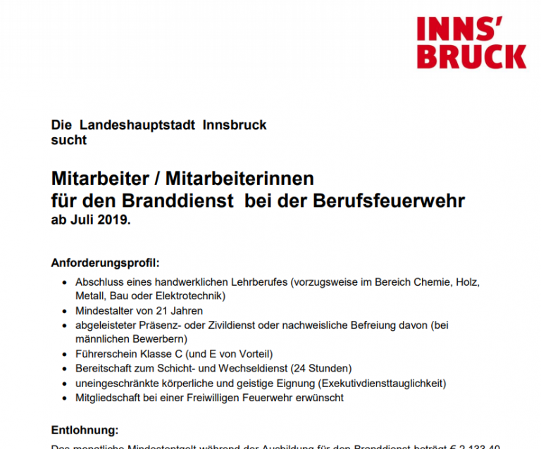 Die Landeshauptstadt Innsbruck sucht Mitarbeiter/Mitarbeiterinnen für den Branddienst bei der Berufsfeuerwehr (ab Juli 2019). Interessierte richten ihre entsprechend belegte Bewerbung unter Anschluss eines Lebenslaufs, der