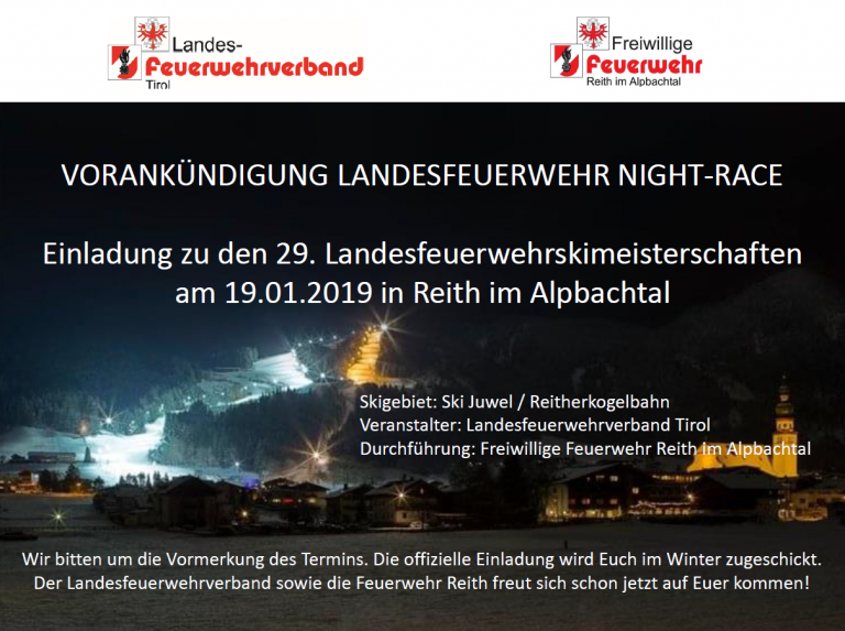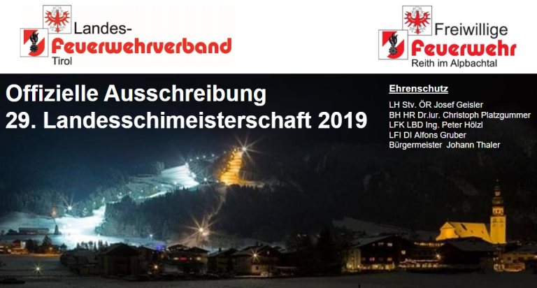 Am Samstag, dem 19.01.2019 findet die 29. Landes-Feuerwehrschimeisterschaft in Reith im Alpachtal statt. Wir bitten den Termin vorzumerken – die offizielle Einladung erfolgt in den