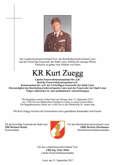 Der Landes-Feuerwehrverband Tirol, der Bezirks-Feuerwehrverband Lienz und die Feuerwehr der Stadt Lienz erfüllen die traurige Pflicht, Nachricht zu geben vom Ableben von Herrn Landes-Feuerwehrkommandant Stellvertreter a.D.