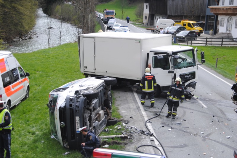 Am frühen Nachmittag kam es am Freitag, den 15. April auf der B 161 zu einem folgenschweren Verkehrsunfall. Eine Fahrzeuglenkerin kam auf die Gegenfahrbahn und kollidierte mit einem Klein-Lkw. Dieser kollidierte mit einem Kleinbus, der ebenfalls umstürzte. Die schwerverletzte Lenkerin wurde in ihrem Fahrzeug eingeklemmt und musste mithilfe der Bergeschere von der Stadtfeuerwehr Kitzbühel geborgen werden. Anschließend wurde sie notärztlich betreut und mit dem Rettungshubschrauber abtransportiert. Eine weitere schwerverletzte Person sowie zwei leicht verletzte Personen wurden vom Notarzt und vom Roten Kreuz versorgt. Insgesamt waren bei diesem Verkehrsunfall 5 Fahrzeuge beteiligt. Im Einsatz standen die Feuerwehr Kitzbühel mit 28 Mann und 6 Einsatzfahrzeugen unter der Leitung von ZGSKDT Peter Überall, das Rote Kreuz und der Notarzthubschrauber C 4.